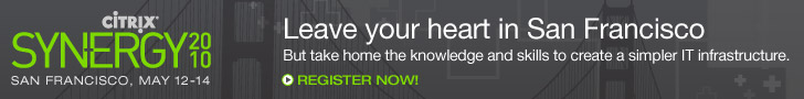 Citrix Synergy 2010 — where virtualization, networking and cloud computing meet—promises to be THE definitive desktop virtualization event of the year, and one of the most pragmatic events for what’s real in the cloud—public and private. This open, global event will show you how to create a simpler and more cost-effective IT infrastructure that will put your organization at the forefront of the coming on-demand IT services era.